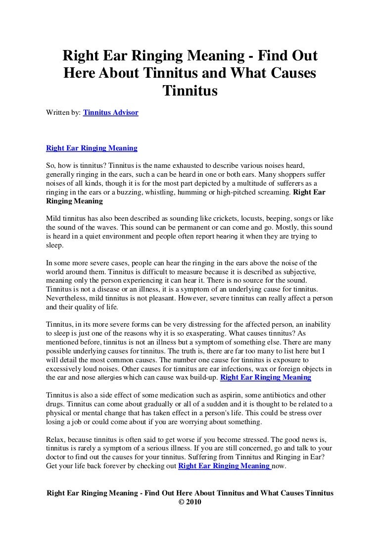 High pitched ringing in right ear. In these page. Whereas mild ringing in the left ear is a warning sign to carefully listen to our intuitions. It is believed that high-pitched ringing in the right ear signifies good fortune or exciting news and is seen as clarification that a positive new chapter is about to begin that something we have been working on or a desired outcome is coming to fruition.