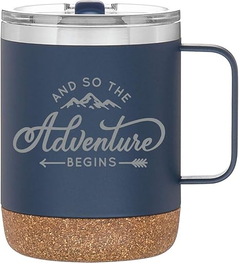 Amazon Com Mugheads And So The Adventure Begins Mug 12oz Camping Mug With Cork Bottom Congratulations Gifts Retirement Gifts For Women Or Men New Job Gift Matte Navy Blue