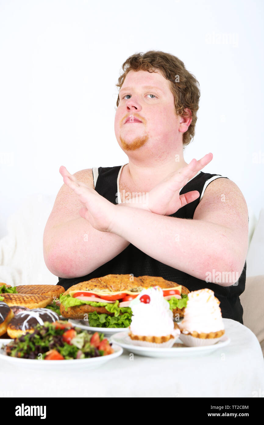 Fat Man Do Not Want To Eat A Lot Of Unhealthy Food On Home Interior Background Stock Photo Alamy