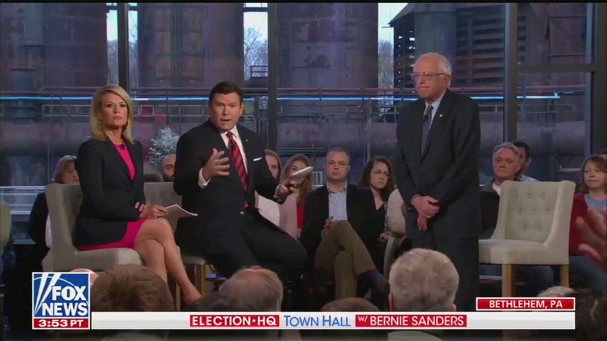 While the first questioner was a. Sanders agreed to a Tax Day town hall on the network moderated by the Special Report anchor Baier and The Story anchor Martha MacCallum. Bernie Sanders asked Rust Belt voters to embrace his most progressive ideas at a Pennsylvania town hall aired on Fox News.
