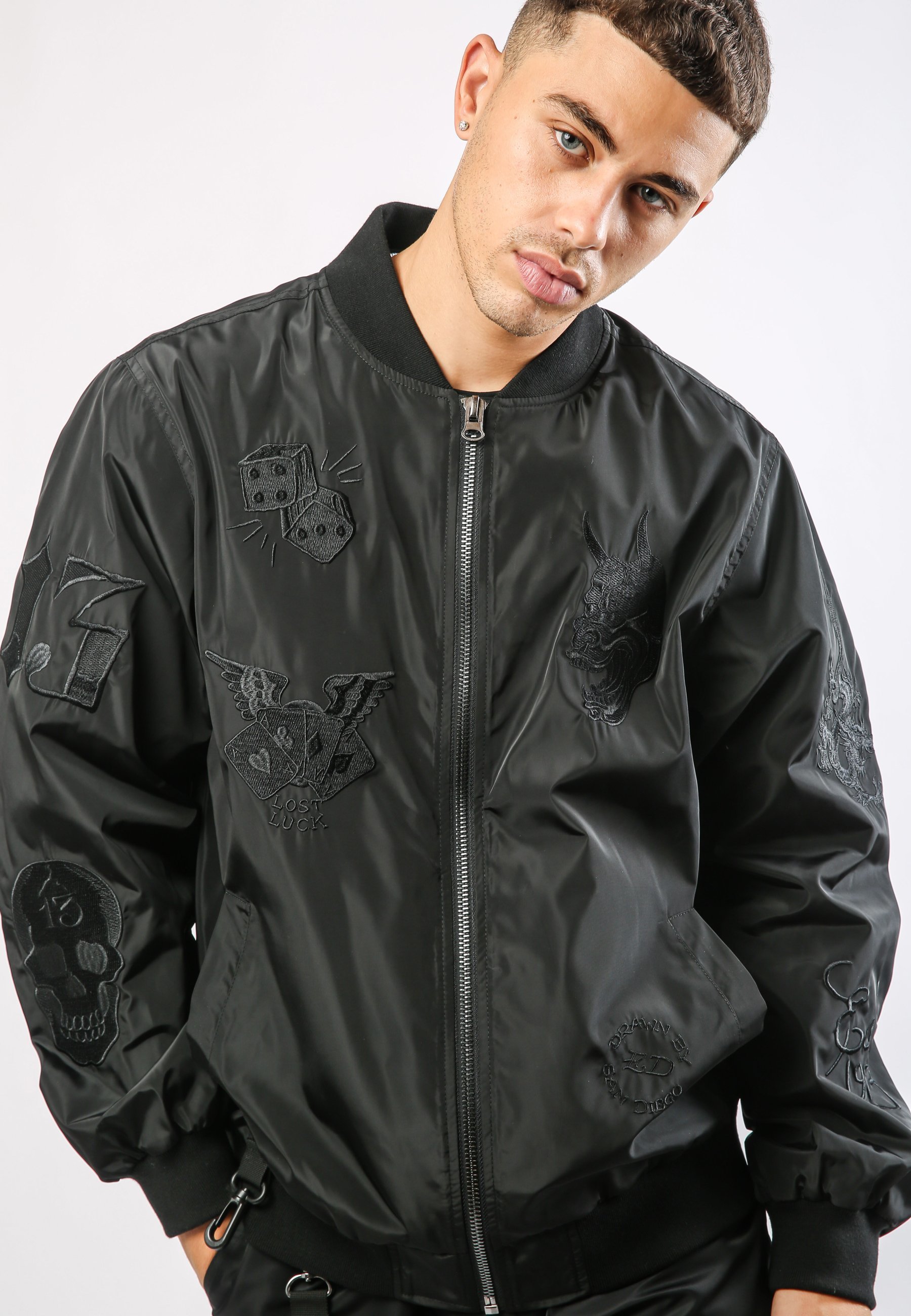 This bomber jacket is designed to emulate original military-issue flight jackets and offers summer-appropriate levels of insulation. Durch die F Durch die F Allover Summer Reversible bomber jacket black crane allover.